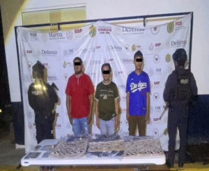 En apoyo a la Fiscalía General del Estado, durante cateos fueron aprehendidas cuatro personas, decomisándoles tres armas de fuego largas y tres cortas, cargadores, cartuchos útiles; 15 bolsas y un frasco con hierba verde similar a la marihuana; 35 bolsas, 10 dosis y un recipiente con una sustancia con características de cristal; armas blancas; radios de comunicación; básculas; una trituradora; teléfonos móviles y una motocicleta sin reporte de robo.