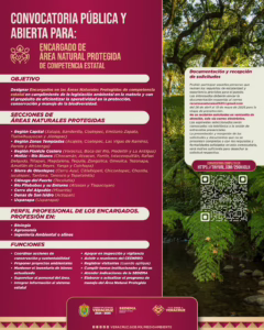 Entre las funciones de los futuros encargados se encuentran elaborar y actualizar programas de manejo, coordinar acciones de conservación, supervisar infraestructura, realizar inspecciones ambientales y asistir a reuniones del Consejo Estatal de Ecología.
