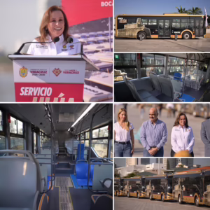 Veracruz. 31 de octubre del 2025..-La mañana de este viernes se realizó el banderazo de salida por parte de la gobernadora de Veracruz Rocio Nahle García, para los nuevos camiones de transporte urbano tipo hibrido en la zona conurbada Veracruz-Boca del Río.