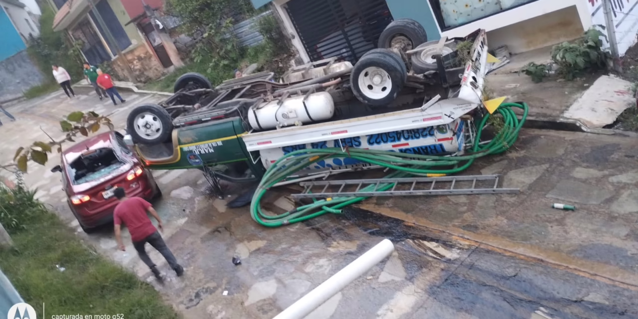 Un pipa de agua sufrió una volcadura e impactó un vehículo marca Ford tipo fiesta color rojo, se reportan personas lesionadas.