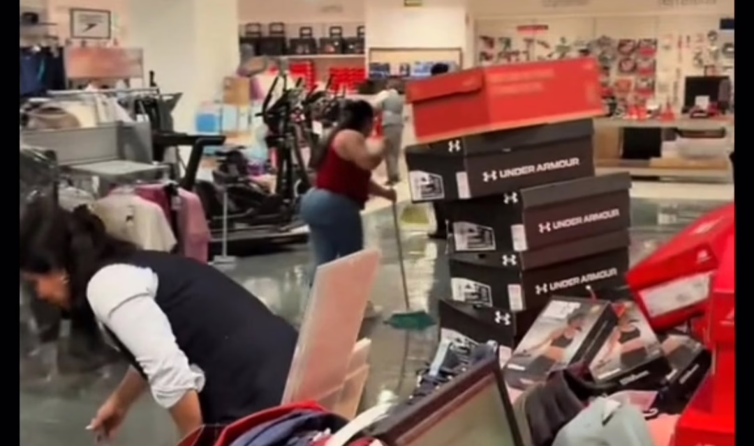 En la tienda departamental Sears, ubicada en Plaza Américas, el plafón sufrió una avería y el agua comenzó a meterse a la tienda.