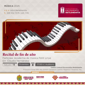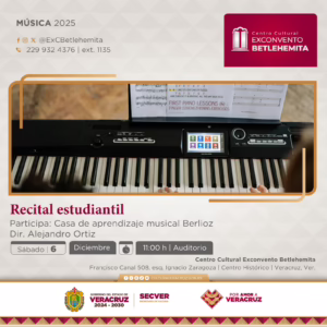 Xalapa, Ver., viernes 05 de diciembre de 2025.- La Secretaría de Cultura de Veracruz (SECVER) invita a disfrutar de los diferentes recitales navideños que escuelas y academias de música presentarán durante el mes en el Centro Cultural Exconvento Betlehemita del puerto de Veracruz. La entrada es libre.