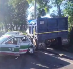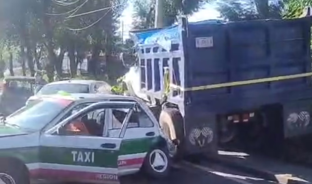 En el percance se vieron involucrados un camión tipo Volteo y un taxi, cuerpos de emergenciaa se dirigen al lugar para auxiliar a los tripulantes de los vehículos.