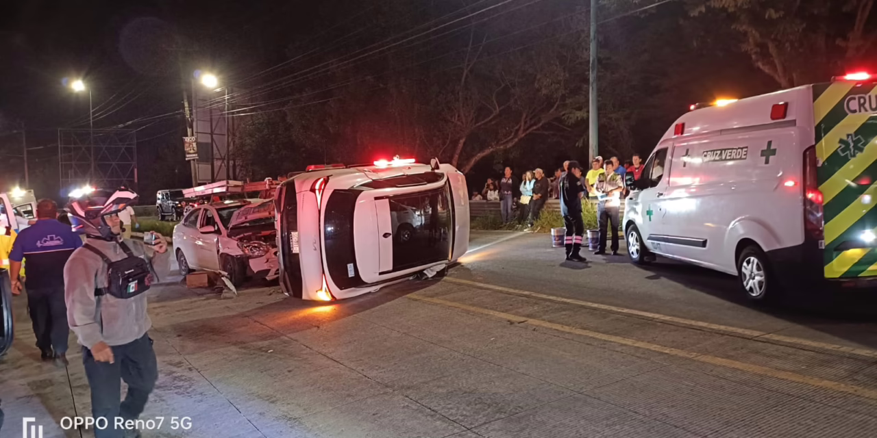 En el percance se vieron involucrados un vehículo marca Chevrolet tipo Aveo color blanco de una empresa de telefonía y una camioneta marca Kia, la cual resultó volcada.