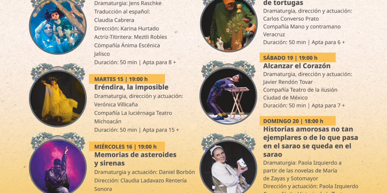 El miércoles 16, también a las 19:00 h, se presenta el unipersonal Memorias de asteroides y sirenas, proveniente de Sonora, con dramaturgia de Jesús Daniel Borbón Soto, dirección de Claudia Landavazo Rentería y actuación de Daniel Borbón. Durante 55 minutos, el escenario se convierte en un espacio para resignificar las experiencias del personaje principal. Recomendado para público a partir de los 17 años.
