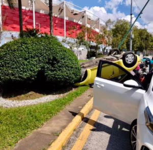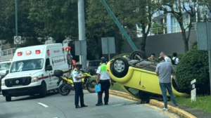 La conductora de un vehículo marca Volkswagen tipo Beetle color amarillo perdió el control de su unidad y se impactó contra una luminaria, para posteriormente sufrir una volcadura.