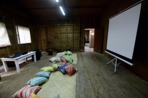 La Cabaña Huitzilin, además de las oficinas y sala de juntas, cuenta con un área de proyección de cine infantil, un jardín polinizador, área de usos múltiples y de capacitación.