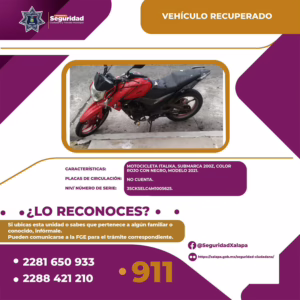 Gracias a un reporte ciudadano, fue localizada una motocicleta color rojo con negro, que permanece bajo resguardo.