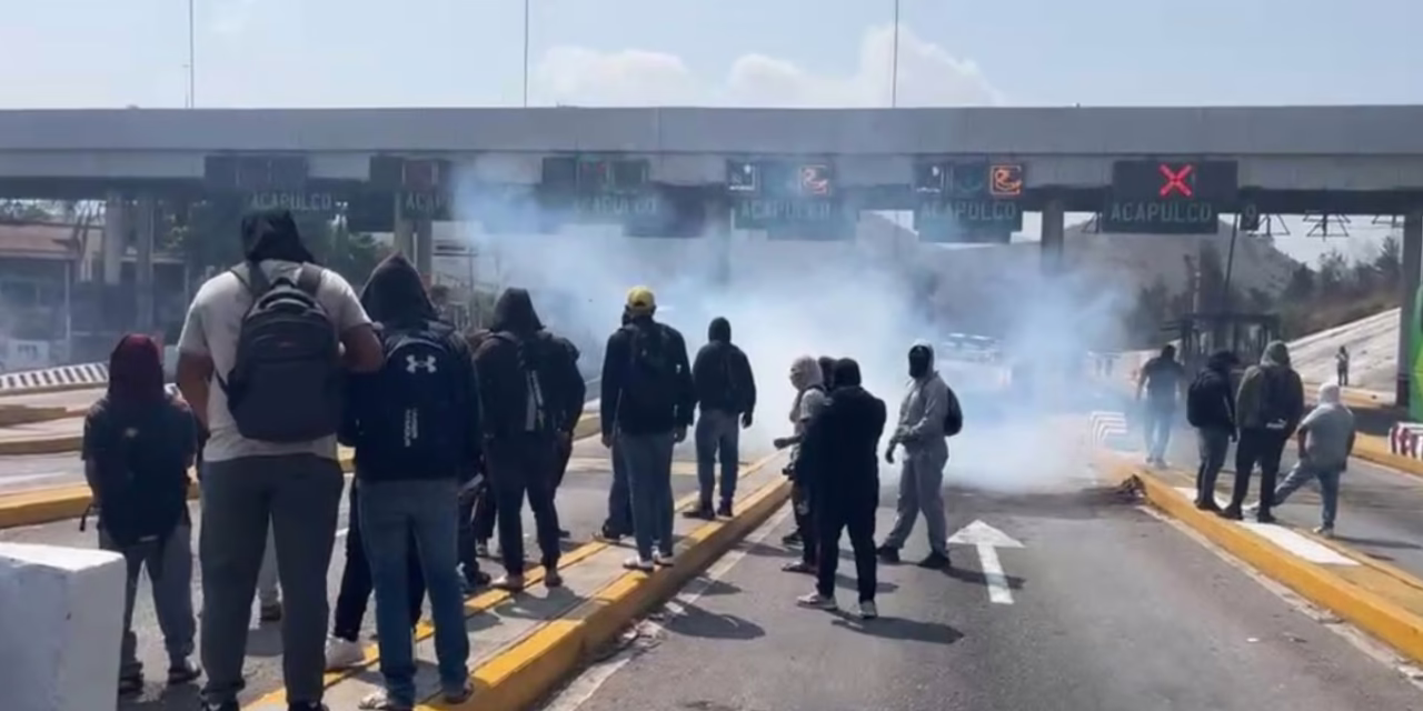 Guerrero. 30 de abril del 2025.-Este miércoles un geupo de estudiantes normalistas de Ayotzinapa vandalizaron la caseta de cobro de Palo Blanco, en la autopista del Sol, para exigir justicia por la muerte de uno de sus voceros, Marco Antonio Suástegui.